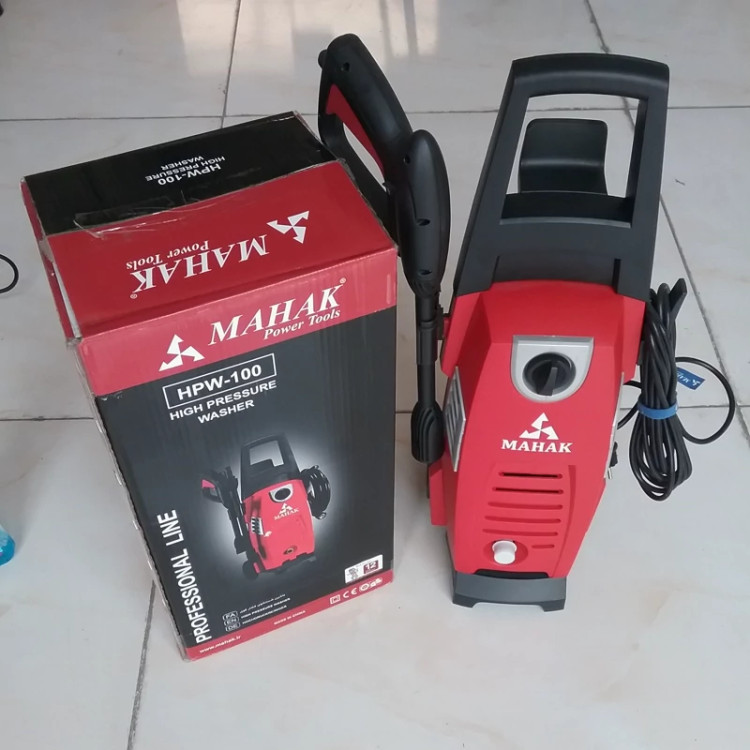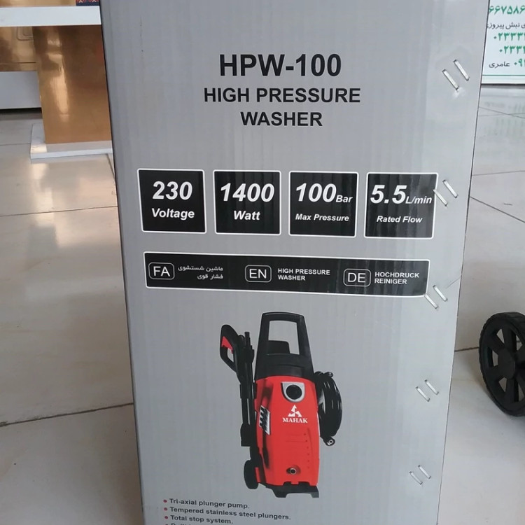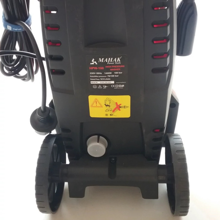 کارواش خانگی محک موتور ذغالی 1400 وات 220 ولت ساخت کشور چین حداکثر فشار خروجی آب 100 بار و حداقل فشار خروجی آب 70 بار دارای چرخ و دسته برای حمل آسان و راحتی کاربر حداکثر دمای ورودی آب 40 درجه سانتی گراد استاندارد IPX5 (مقاوم در برابر رطوبت)